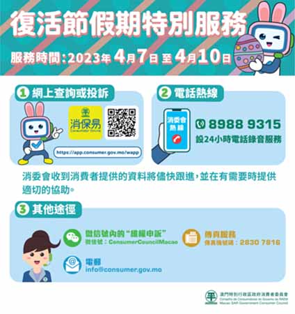 消費者在上述期間,如有查詢或投訴可透過以下途徑聯絡消委會:“消保易”一項簡捷的網上服務。消費者可隨時以手機等移動裝置掃描“消保易”二維碼或利用網頁連結(https://app.consumer.gov.mo/wapp)登入,在平台內以文字或照(圖)片提供資料;電話熱線:89889315(設24小時電話錄音服務)。