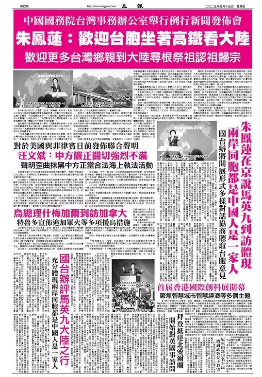 【新華社北京4月12日電】(記者趙博、劉歡、王承昊)國台辦發言人朱鳳蓮12日在例行新聞發佈會上表示,馬英九先生的大陸之行充分體現兩岸同胞都是中國人、是一家人,有著共同的血脈、共同的文化、共同的歷史、共同的願景,反映兩岸同胞要和平、要發展、要交流、要合作的共同心聲,再次證明“九二共識”是兩岸關係和平發展的定海神針。