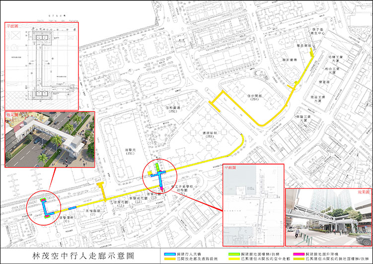 因空中走廊重新規劃和連接點優化,會由特區政府統籌興建,但原土地承批人需分攤原特別負擔的相關工程費用。兩項行人天橋預計2024年內落成,屆時可透過人車分隔的空中走廊步道連接林茂塘至筷子基一帶,進一步優化該區的安全和綠色出行的條件。另外,為使空中走廊整體能貫通已建成大廈的公共走廊部分,形成一個連續的步行系統,政府正督促各土地承批人加緊配合同步開放。