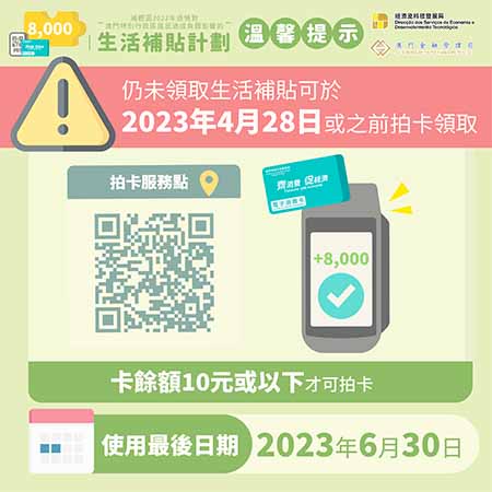 【特訊】經濟及科技發展局及金融管理局表示,“生活補貼計劃”的最後拍卡領取日為2023年4月28日,特區政府呼籲,使用消費卡且已獲取第三輪抗疫電子消費優惠的合資格居民,如仍未領取8,000元生活補貼,最遲於今日(28)日拍卡領取。