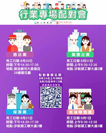 9月1日上午舉辦高端零售業配對會,提供25個職位空缺,涉及銷售員及禮賓員。