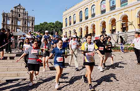 起步槍響起,托盤比賽正式開始,當中參賽特別嘉賓–澳門旅遊吉祥物“麥麥"穿著“澳門有禮運動”服飾,手持載有一瓶“澳門啤酒"的托盤從大三巴牌坊出發,與一眾參賽者一同起步,穿梭“澳門歷史城區"街道,務求盡快將啤酒安全送達終點站議事亭前地,過程刺激有趣,沿途吸引旅客駐足拍照,替參賽者打氣,展現澳門的旅遊魅力。