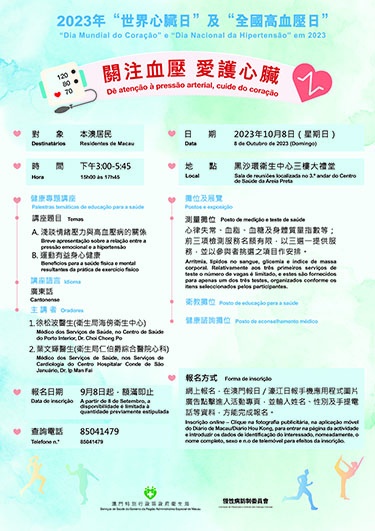 為響應「世界心臟日」及 10 月 8 日「全國高血壓日」,衛生局早前聯同健康城市委員會及慢性病防制委員會共同合辦、澳門美術協會協辦了「保護健康心臟」繪畫比賽;並將於10 月 8 日聯同慢性病防制委員會舉辦「關注血壓愛護心臟」活動,活動將安排「淺談情緒壓力與高血壓的關係」、「運動有益身心健康」等專題講座,現場設有健康諮詢和教育攤位,「保護健康心臟」繪畫比賽畫展和健康知識展板等;另外還設有系列測量攤位,如心律、血脂、血糖及身體質量指數等。歡迎居民屆時親臨參加上述活動,因名額有限,若有意參加可掃描附圖二維碼報名,或點擊《澳門日報》或《濠江日報》的手機Apps上的「關注血壓 愛護心臟」活動廣告進行報名。