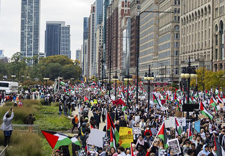 一再表明堅定支持以色列的美國,多個城市都有支持巴勒斯坦的示威,數百人在首都華盛頓特區的國家廣場舉起巴勒斯坦旗幟,要求以色列和哈馬斯停火。休士頓都有數百人遊行支持巴勒斯坦。部分人更到國會山莊附近,表達停戰訴求。