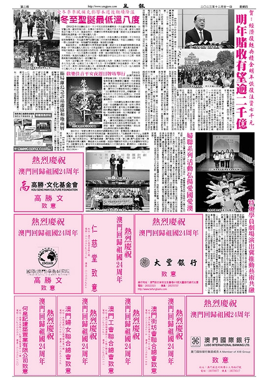 【特訊】由澳門基督徒音樂協會主辦,文化局合辦,十多個基督教教會及機構聯合籌辦,市政署協辦,澳門特別行政區政府文化發展基金為支持單位,澳門澳門霍英東基金會、澳門可口可樂飲料有限公司贊助之「2023歡樂佳音平安夜」綜藝晚會,定於本年十二月廿四日(星期日),平安夜晚上八時至十二時假大三巴牌坊耶穌會廣場舉行。