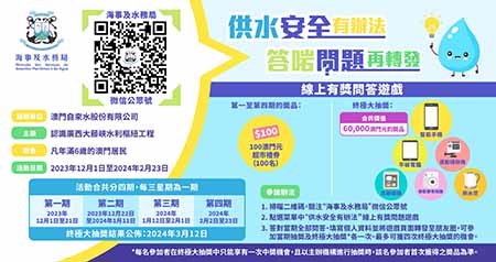 “供水安全有辦法"線上有奬問答遊戲於2023年12月1日至2024年2月23日期間分四期進行,每三週為一期,設有每期抽獎及終極大抽獎。第一期活動日前已結束,近一千名市民參與。海事及水務局從中抽出一百名得獎者,得獎名單已上載至海事及水務局網頁及微信公眾號,海事及水務局會以電話短訊通知領獎安排,得獎者於限期內需憑短訊和身份證明文件等資料到澳門萬里長城海事及水務局大樓綜合服務中心領獎。