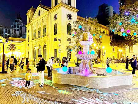 6個燈光裝置:繁花簇錦:在十六號碼頭樓頂設置四朵發光蓮花裝置及射燈。花映繽紛:隨風擺動的圓形花朵圖案使街道充滿色彩。懷舊澳門情:以澳門70年代的霓虹燈牌作藍本,配以富中華文化的節慶圖案,增添龍年璀璨氣氛。繽紛人力車:LED霓虹燈牌和發光花朵打造引人注目的打卡位置。彩燈耀濠江:每晚8時及9時在大堂前地的噴水池周邊上映約1分鐘的燈光表演。幻燈拱門:沿著板樟堂巷懸掛有澳門標誌性圖片的照明圓燈,為訪客打造一條歡迎之路。