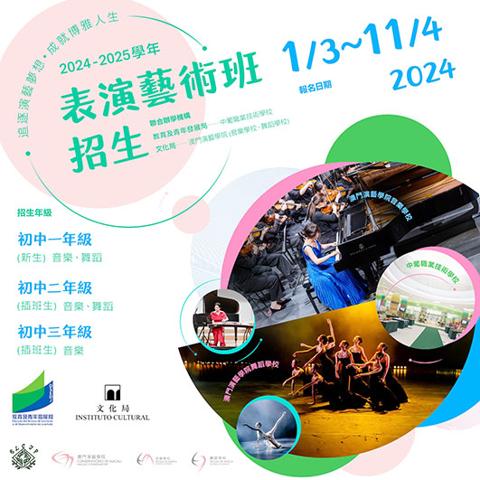【特訊】由教育及青年發展局與文化局聯合開辦的表演藝術課程,招收2024/2025學年初一年級新生、初二及初三年級插班生,即日起至4月11日接受報名。該課程由教青局轄下中葡職業技術學校聯合文化局轄下澳門演藝學院開辦,整合資源優勢,協同培養澳門表演藝術人才。歡迎對音樂、舞蹈表演藝術有興趣的學生報讀。