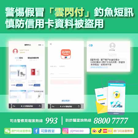 【特訊】日前司警局先後接獲十多名市民檢舉,報稱收到以電子支付平台“雲閃付”名義發出的短訊,內容以“積分即將到期”為由誘使事主點擊短訊內附帶之連結,繼而進入一個假冒網站並可以低價及積分兌換禮品,藉此套取事主的個人及信用卡資料,事主在輸入一次性驗證碼後,最終導致信用卡被盜用,造成各事主數千至數萬元不等的損失。由於上述案件中騙徒透過技術手段將發出之釣魚短訊號碼更改成與雲閃付官方號碼一致,從而使事主手機將涉案釣魚短訊發送者識別為“unionpay”,以致事主誤以為有關虛假訊息為官方發出。