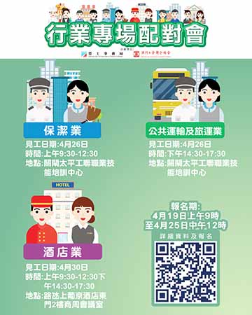 上述4月26日上午保潔業配對會及下午旅運及公共運輸業配對會在澳門工聯職業技能培訓中心(關閘馬路101-105A號太平工業大廈第一期1樓)舉行;4月30日酒店業配對會在澳門上葡京2樓商周會議室舉行。報名日期為4月19日上午9時至4月25日中午12時。
