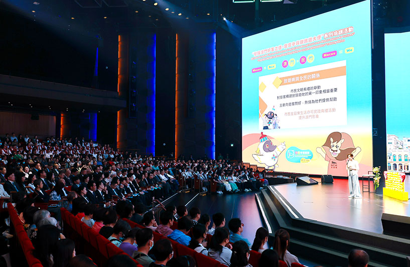 「發揮澳門好客之道,齊齊參與做旅遊大使」系列培訓活動啟動儀式昨日在美高梅劇院舉行,中聯辦經濟部副處長楊毅、旅遊局副局長程衛東、美高梅中國控股有限公司總裁及執行董事馮小峰、各支持單位代表、旅遊及相關業界、政府部門、工商界、教育、街坊、婦女、餐飲、交通等協會及社團代表以及一眾教育工作者、老師及學生接近八百人出席。