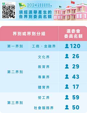 行政長官選委會由四個界別的400名人士組成,其中,第一界別工商、金融界,第二界別的文化界、教育界、專業界和體育界,以及第三界別中的勞工界和社會服務界,共344名委員經由相應界別或界別分組的法人選民依法選舉產生。