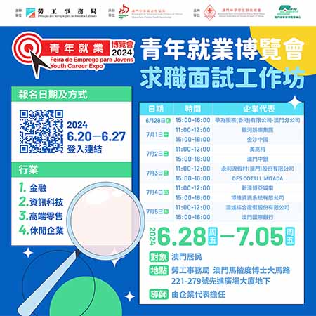 【特訊】由勞工事務局主辦的“青年就業博覽會2024”將於7月中旬推出,今年繼續舉辦大型招聘會,為協助即將投入職場的青年朋友做好求職前的就業準備,勞工局邀請大型企業資深人力資源顧問擔任工作坊導師,由6月28日至7月5日期間,合共推出11場求職面試工作坊,6月20日起接受網上報名。參與“青年就業博覽會2024”的大型招聘的企業,目前已超過50家,並收集到近1,500個職缺。勞工局針對參與招聘的相關行業,如金融業、資訊科技業及綜合休閒服務業,邀請相關企業的資深人資顧問擔任工作坊導師,由6月28日至7月5日合共推出11場求職面試工作坊,為即將進入職場的求職青年介紹行業發展前景,教授求職面試和撰寫履歷的技巧,讓青年做好應徵面試的準備。