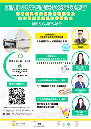 【特訊】為推動本澳餐飲業提升營運效率,開拓更多商機,由經濟及科技發展局主辦、澳門生產力暨科技轉移中心承辦的“澳門餐飲業智能升級方案分享會”將於7月30日下午3時至5時在中國與葡語國家商貿合作服務平台綜合體舉行。