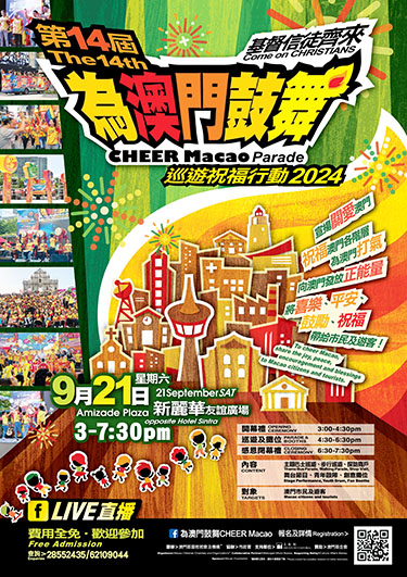 【特訊】由澳門基督徒音樂協會主辦,市政署協辦,二十多間澳門基督教教會及機構籌辦,澳門基金會贊助,文化局作為支持單位之「為澳門鼓舞」巡遊祝福行動將於2024年9月21日(本周六)假澳門新麗華友誼廣場舉行。歡迎市民及遊客參與。大會持續第十四年發揮五大目的:「同心同行」、「傳遞關愛」、「宣揚正能量」、「實踐服侍」及「助長社會積極發展」。透過豐富舞台節目、步行/主題巴士巡遊等項目,發放關愛正能量,向大眾宣揚愛澳門、愛鄰舍之美德,為社區各階層人士打氣,祈願澳門得著最寶貴祝福。 激勵市民大眾帶著關愛能量,同心合力拒絕「暴力」、「紛爭」、「色情」、「消極」、「自殺」等負面思想影響澳門。