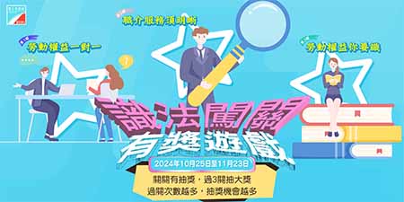 【特訊】勞工事務局持續向公眾推廣勞動權益,已先後推出「eLearning勞動權益知多D」和「eLearning職業介紹所業務法」網上課程。為鼓勵巿民參與網上學習課程,認識權益。勞工局於10月25日至11月23日期間推出「識法闖關」有獎遊戲活動。