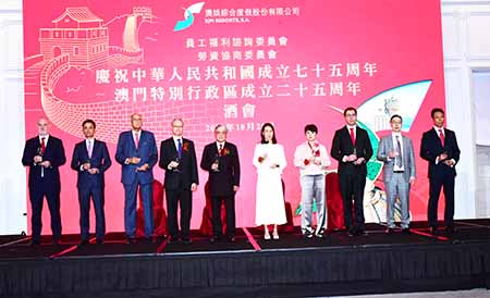 澳娛綜合聯同澳娛綜合員工福利諮詢委員會、澳娛綜合勞資協商委員會,昨日於上葡京綜合度假村的上葡京禮堂舉行兩場盛大的雙慶酒會,慶祝中華人民共和國成立七十五周年及澳門特別行政區成立二十五周年。澳娛綜合董事局主席霍震霆、常務董事何超鳳、董事兼福諮會主席梁安琪、董事岑康權、勞資協商委員會顧問黃顯輝及其代表黃景禧律師,以及約三千名員工出席雙慶酒會,共同向祖國及澳門送上美好的祝願。