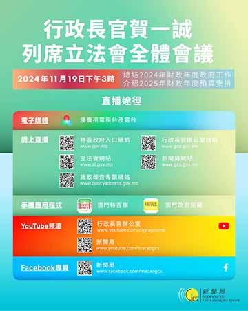 屆時,澳廣視屬下電視台及電台將會現場直播。公眾亦可透過澳門特別行政區政府入口網站,行政長官辦公室、立法會和新聞局的網站,施政報告專題網站,行政長官辦公室和新聞局的手機應用程式及專屬Youtube頻道,以及新聞局Facebook專頁,觀看網上直播。