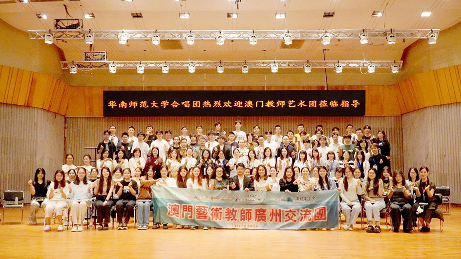 次日,教師們先前往廣州美術學院嶺南畫派紀念館,體驗當代藝術的風采。其後,團員們拜訪廣州美術學院集美研究院及廣東省集美設計工程有限公司進行交流探討,進一步促進澳門與內地藝術教師在藝術設計產學研領域的緊密合作,共同推動灣區藝術設計產業的蓬勃發展。最後前往華南師範學院進行學習交流,與華師合唱團共同合唱了“我和我的祖國",現場氣氛熱烈。