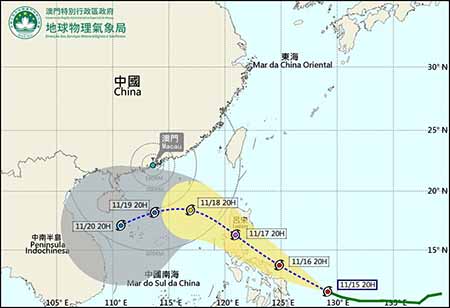 氣象局預料,熱帶氣旋「萬宜」下週一(十八日)早上進入本澳八百公里範圍,當局將適時發出熱帶氣旋信號。按照現時預測路徑,位於菲律賓以東的「萬宜」,未來數日將向西北移動。同時,一股較強東北季風將抵達華南沿岸,本澳氣溫將會略降,早晚天氣稍涼。於昨日晚上二十時,超強颱風萬宜正集結在澳門東南約二千零四十公里處,以時速約廿五公里向西北偏西方向移動,大致趨向菲律賓。