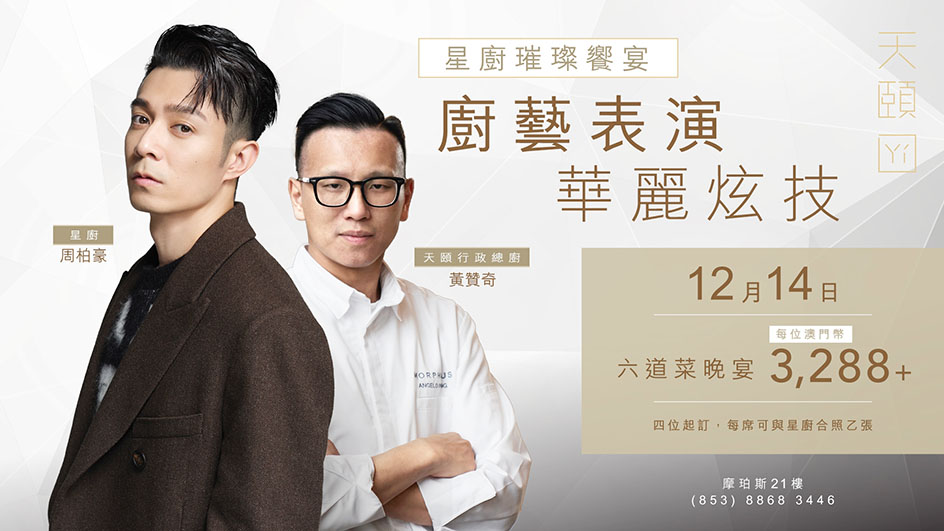【特訊】新濠天地摩珀斯酒店的黑珍珠一鑽高級中菜廳「天頤」將於12月14日(星期六)為「星廚璀璨饗宴」揭開華麗序幕。香港型男歌手周柏豪將聯手「天頤」行政總廚黃贊奇為饗宴打頭陣,以「花式花食」炮製只此一夜的時令創意華席,不僅令人賞心悅目更同時觸動味蕾。活動座位有限,並現正接受預訂。