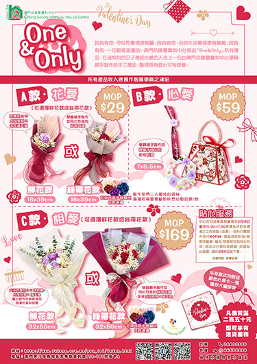 【特訊】澳門扶康會寶利中心作為職業培訓中心,一直致力為服務使用者提供各種職業培訓機會,希望在過程中提升他們的就業能力,讓他們能憑藉自己努力取得工作收入,同時在中心適應社羣生活,有助他們融入社會,活出豐盛人生。每逢節日,寶利中心都會推出應節禮品,期望帶給大眾多一點禮品上的選擇外,同時亦可以為殘疾人士帶來工作機會,產生津貼收益,讓他們可以自力更生,而寶利中心藉著2025情人節推出「One & Only」系列禮品。「One & Only」系列禮品包括三個款式:花愛、心愛、相愛。
