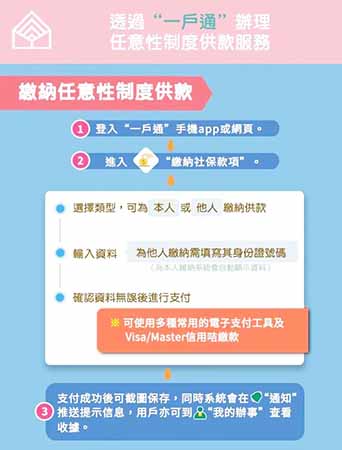 而任意性制度受益人於供款月內可以“一戶通”繳納供款,或透過指定銀行的電子渠道及櫃枱、銀通網路自動櫃員機、自助服務機等電子化方式繳款。