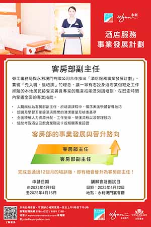 【特訊】為培育本地人才,提供職業發展機會,勞工事務局(下稱“勞工局")和永利澳門有限公司(下稱“永利")合作推出“永利酒店事業發展計劃"(下稱“計劃"),以“先入職、後培訓”方式,為有志投身綜合休閒旅遊服務行業的澳門居民提供一系列的專業培訓及工作實踐,計劃由4月9日起接受申請。