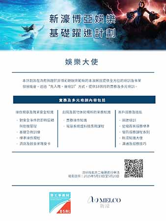 【特訊】為支持本地人才全面發展,拓展多元職涯路向,勞工事務局(下稱“勞工局”)和新濠博亞娛樂有限公司(下稱“新濠博亞”)合作推出“新濠博亞娛樂基礎躍進計劃”(下稱“計劃”),以“先入職、後培訓”方式,為有興趣從事非博彩類娛樂範疇的本澳居民,提供全方位的培訓及事業發展機會,計劃由5月13日起接受申請。