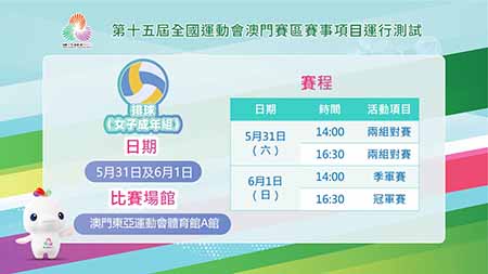 【特訊】第十五屆全國運動會澳門賽區排球(女子成年組)項目運行測試於5月31日及6月1日在澳門東亞運動會體育館A館舉行,活動由十五運會及殘特奧會澳門賽區籌備辦公室主辦,中國澳門排球總會協辦,邀請了廣東、湖南與澳門兩支球隊作賽,賽事將於下午兩時開始,持票人士可在比賽開始前一小時入場,歡迎市民及旅客入場觀賞比賽。