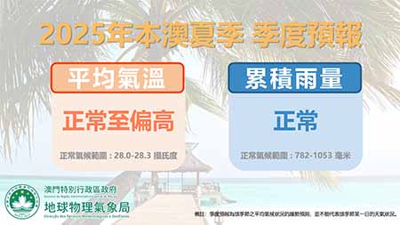 氣候小知識︰根據世界氣象組織指引,通過計算1991年至2020年氣候標準平均值,以及利用分位法得出本澳夏季氣溫正常氣候範圍為攝氏28.0至28.3度,累積雨量正常氣候範圍為782至1053毫米。當季度預報中預測平均氣溫偏高是指高於正常氣候範圍,偏低是指低於正常氣候範圍。當季度預報中預測累積降雨偏多代表多於正常氣候範圍,偏少代表少於正常氣候範圍。
