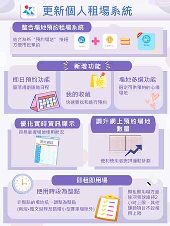 【特訊】為提升市民使用體育局轄下體育設施的體驗,體育局於2025年6月20日起更新個人租場系統,將多方面優化租場界面及功能,讓市民能夠更便捷地預約體育設施,提升個人化的操作體驗。此外,體育局亦對現行的租場措施進行優化及調整,包括新增網上即日預約服務、統一體育設施的租場時間為整點、調升預約場地數量比例、以及統一各體育設施的每日租用時數上限等,進一步便利市民規劃運動日程。