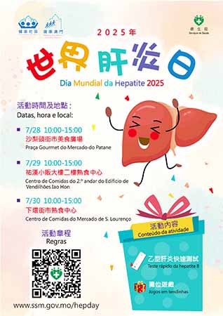 為落實《健康澳門藍圖》所訂定的總體目標和指標,澳門特區政府積極推動“健康社區”計劃,通過政府跨部門協作及聯動社團機構力量,發揮協同效應,持續開展多元化社區健康科普活動,致力提升居民健康素養與促進自我健康管理能力。藉着7月28日“世界肝炎日”,衛生局於當日至7月30日一連三日在街市的熟食中心舉辦三場“2025年世界肝炎日活動”,以喚起居民對乙型肝炎的認識及關注。