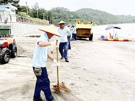 勞工局制定了《熱帶氣旋、暴雨及特殊天氣等情況下的工作安全指引》供業界參考,以及高空工作、起重機械、棚架及用電安全資料,詳情可瀏覽勞工局「職安健天地」專題網頁了解詳情,或致電28717781查詢。另外,海事及水務局表,由於颱風及暴雨,上游大量海上垃圾隨水流漂到澳門海岸,近日被沖上黑沙和竹灣海灘灘面,當中以植物枯枝和生活垃圾為主。海事及水務局已協調清潔專營公司加派人手清理,預料有關情況將持續數日,局方會派員加密巡視海灘。