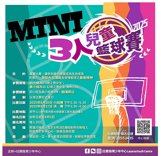 【特訊】由拉撒路青少年中心主辦之迷你三人兒童籃球賽將在8月10及17日在拉撒路青少年中心會址舉行。此次比賽以淘汰賽形式進行。目的是讓參加者在歡樂競賽的氛圍中,將打籃球之興趣成為生命成長的動力,激發內在潛能及發揮優良品格,積極面對困難,突破已有的能力,提升自信、合作、尊重、恆心、包容、責任感、主動、鬥志、剛毅、守紀、耐性、謹慎等品格,建立精彩剛強的生命。
