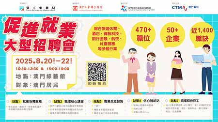 【特訊】為全力促進各階層求職者對接就業及助力居民向上流動,由勞工事務局主辦、澳門工會聯合總會承辦的“促進就業大型招聘會”將於8月20日至22日假澳門綜藝館舉行,現場提供近1,400個職缺、約470多個職位供求職者選配和即場面試。