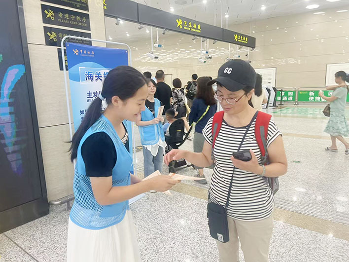 社工採用 “認知-技能-實踐”三級賦能框架,依託橫琴海關專業資源,開展通關政策及基肯孔雅熱疫情防控知識培訓,幫助青少年志願者理解跨境政策的社會意義,通過互動環節瞭解“國門守護者”的職能職責。隨後的實踐環節,"少年關務員"在引導旅客、協助通關及疫情防控宣傳等任務中,以小組協作形式進行社會實踐。疫情防控宣傳的負責志願者手持宣傳單張,用簡潔易懂的語言向過境旅客宣講基孔肯雅熱防控要點。行李過機檢測區負責志願者則主動上前協助攜帶大件行李或者懷抱寶寶的旅客,他們熟練將行李箱平穩放置在傳送帶。在客流疏導崗位上,志願者們化身"人形導航",用標準的手勢和清晰規範的指引語引導旅客有序通行。真實服務場景使青少年在“做中學”中內化知識,進一步提升社會適應力。過關旅客紛紛稱讚,青少年志願者們用自己的貼心服務溫暖了大家的旅途,以實際行動傳遞了愛與關懷,自己在這裡感受到了志願者的青春活力與善意,也充分體驗到橫琴口岸通關的高效便捷。