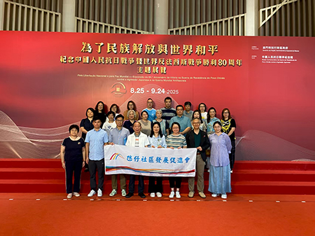 【特訊】氹仔社區發展促進會組織25名會員參觀“為了民族解放與世界和平——紀念中國人民抗日戰爭暨世界反法西斯戰爭勝利八十周年”主題展覽,出席者包括副會長崔英,常務副理事長江旭純、副理事長徐承康、余致力、陳述、曾少瑩、王朝蓉、副監事長張名威、吳珍珍以及街坊總會離島工作委員會主任林偉雄。