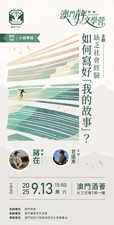 【特訊】由澳門筆會主辦的澳門青年文學營,將於九月十三日(周六)下午三點於大三巴巷七號一樓舉行小說專題課,邀請內地新銳作家蔣在以“缺乏社會經驗,如何寫好我的故事?”為題,聚焦新手寫作的核心痛點,探討如何將個人經驗轉化為小說素材,突破同質化寫作困境。活動歡迎廣大文學愛好者報名參加。文學營營長、澳門作家廖子馨將出席。活動由文學營策劃人、澳門詩人甘遠來主持。