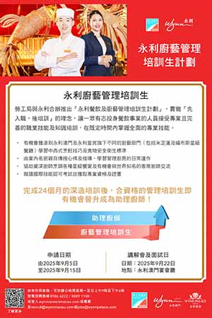【特訊】為培養及提升澳門餐飲人才的專業餐飲知識及廚藝技能,勞工事務局和永利澳門有限公司(下稱“永利")合作推出“永利餐飲及廚藝管理培訓生計劃"(下稱“計劃"),以“先入職、後培訓”方式,為有志投身綜合休閒旅遊服務行業的澳門居民提供全方位培訓及發展階梯,計劃由9月5日起接受申請。