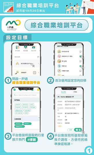 【特訊】為配合特區政府“1+4”經濟適度多元發展策略,進一步提升市民職業技能與就業競爭力,勞工事務局(下稱“勞工局”)今(30)日在“一戶通”平台推出“綜合職業培訓平台”試用版。市民可透過此線上單一平台報讀不同培訓機構的課程,享受更便捷的一站式職業培訓服務;平台亦設有意見欄,歡迎市民提供意見,共同完善平台功能。