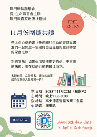 此次11月份「圍爐共讀」延續「愛•生命讀書會」的溫暖風格,特別選擇在高士德宣道堂五餅二魚室舉行。這處場地以聖經故事「五餅二魚」為名,象徵從有限資源中創造豐盛的奇蹟,完美呼應「斷捨離」的哲學——透過捨棄多餘,放大內在的豐足。活動時間僅一小時,形式輕鬆互動,參與者可圍坐一圈,分享讀書心得、個人讀書體驗,或討論如何在澳門這個繁華都市中實踐極簡生活。報名熱線66995600陳小姐