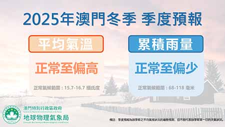 氣象局表示,根據世界氣象組織指引,通過計算一九九一年至二零二零年氣候標準平均值,以及利用分位法得出本澳冬季氣溫正常氣候範圍為攝氏十五點七度至十六點七度,累積雨量正常氣候範圍為六十八至一百一十八毫米。當季度預報中預測平均氣溫偏高是指高於正常氣候範圍,偏低是指低於正常氣候範圍。當季度預報中預測累積降雨偏多代表多於正常氣候範圍,偏少代表少於正常氣候範圍。