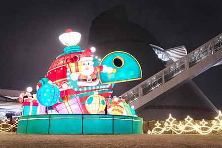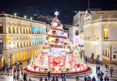 當中於議事亭前地除佈置大型燈光隧道外,還安裝了一組色彩繽紛的大型聖誕樹,以金色蝴蝶結為主軸,堆疊各式各樣彩球;樹兩旁以旋轉樓梯作點綴,周邊配置禮物盒、彩球以及造型可愛的聖誕老人及小精靈,增添了趣味和節慶感。另外,於澳門科學館亦可見到聖誕老人乘坐太空船降落的座地燈飾;氹仔中央公園則配置了多個造型可愛聖誕角色的聖誕樹、各類燈光裝置及聖誕吊飾;運動場圓形地以遊樂園為主題,透過聖誕老人、雪人、薑餅人等,傳遞歡樂溫馨的氣氛。