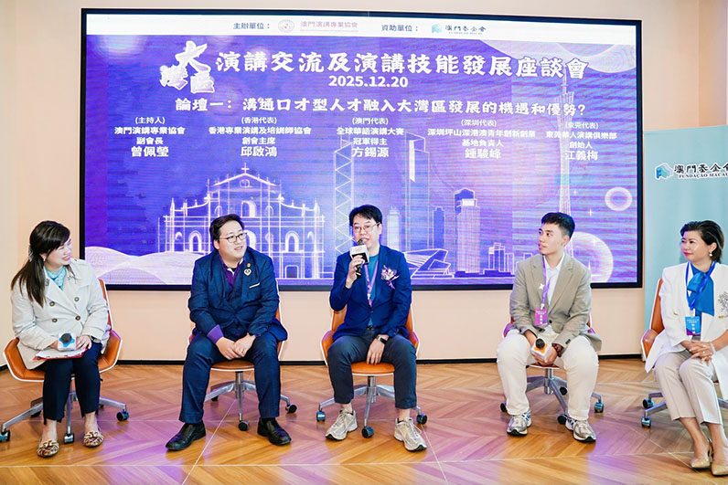 【特訊】由澳門演講專業協會主辦、澳門基金會資助的“大灣區演講交流及演講技能發展座談會”近日在橫琴金匯國際廣場德道職業培訓學校圓滿落幕,活動吸引近200名業界人士參與。座談會中包含兩大論壇,聚焦大灣區人才融合與行業競爭力。首場論壇圍繞“溝通口才型人才融入大灣區發展的機遇和優勢”展開。香港專業演講及培訓師協會創會主席邱啟鴻、全球華語演講大賽冠軍方錫源、深圳坪山深港澳青年創新創業基地負責人鐘駿峰、東莞華人演講俱樂部創始人江義梅四位嘉賓深入對話。