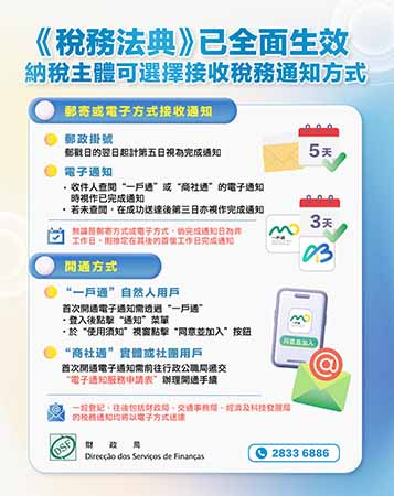【特訊】為配合特區政府的電子政務發展,《稅務法典》新增以電子方式接收稅務行政當局的稅務通知,納稅主體除了可以郵寄方式接收稅務通知外,還可選擇透過“一戶通” 或“商社通”以電子方式接收稅務通知。