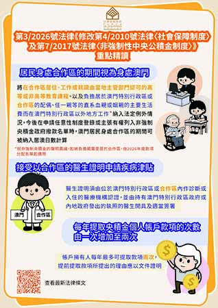 【特訊】第3/2026號法律《修改第4/2010號法律〈社會保障制度〉及第7/2017號法律〈非強制性中央公積金制度〉》,自2026年3月24日起生效。