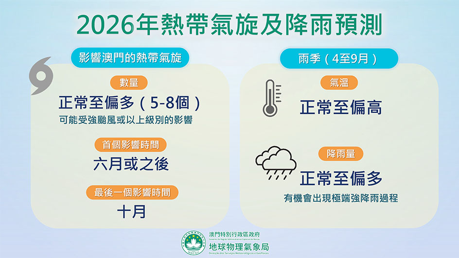 氣象局表示,根據最新的海洋觀測及預報資料顯示,「拉尼娜」狀態正逐漸緩和,春季將有機會回復至「ENSO中性」狀態,並在夏季進入「厄爾尼諾」狀態。地球物理氣象局預測今年(2026年)約有五至八個熱帶氣旋影響澳門,數量正常至偏多,且可能受強颱風或以上級別影響,預料風季將在六月或之後開始,十月結束。同時,預測今年雨季(四至九月)的平均氣溫屬正常至偏高,累積降雨量屬正常至偏多,並可能出現極端強降雨過程。