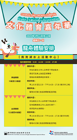 文化局與體育局將於4月11日及12日聯合主辦“文化體育嘉年華”,主場設於南灣湖水上活動中心,並延伸至大三巴牌坊、盧家大屋、慕拉士前地休憩區、青洲坊及石排灣樂群樓平台等多個世遺景點及社區。開幕式於4月11日上午10時30分舉行,屆時有花式跳繩結合打擊樂、青少年粵劇跨界街舞及河南登封少林功夫表演,為一連兩天的嘉年華揭開序幕。
