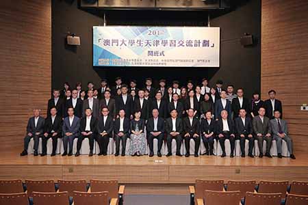 【特訊】六月六日,由全國政協港澳台僑委員會、天津市政協、中央人民政府駐澳門聯絡辦公室及澳門基金會主辦,澳門旅遊學院及天津南開大學旅遊與服務學院協辦的2017「澳門大學生天津學習交流計劃」於澳門旅遊學院舉行開班儀式。出席的主要嘉賓包括全國政協何厚鏵副主席、全國政協港澳台僑委員會華建副主任、天津市政協臧獻甫主席、中央人民政府駐澳門特別行政區聯絡辦公室陳斯喜副主任、澳門基金會行政委員會吳志良主席、澳區全國政協常委楊俊文、曹其真、廖澤雲及顏延齡、委員梁華、林金城、黎振強及李向玉、天津市政協常委鄭志強、委員蕭志偉、澳門旅遊學院、天津南開大學以及其他四間澳門高校代表等。